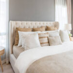 tv chair in the living room Bedroom in soft light colors. big comfortable double bed in elegant classic bedroom at home. Bedroom interior with wooden furniture, 3d render New Arrivals